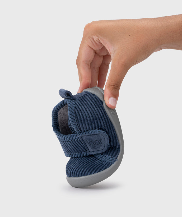 Zapatos de casa IGOR en pana, con cierre adherente que facilita el uso. Ideales para el descanso en el hogar, su diseño de suela plana favorece el desarrollo natural del pie. Son flexibles, suaves, ligeros y cálidos, perfectos para acompañar a los más pequeños desde sus primeros pasos y fomentar su autonomía.