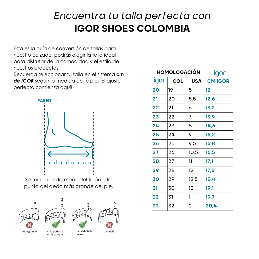 Estos tenis IGOR están fabricados en lona 100% algodón, con cierre adherente que facilita su uso y fomenta la autonomía. Su diseño con suela plana, promueve el desarrollo natural del pie, mientras su estructura es flexible, suave y ligera: perfectos para acompañar cada paso con libertad y comodidad.